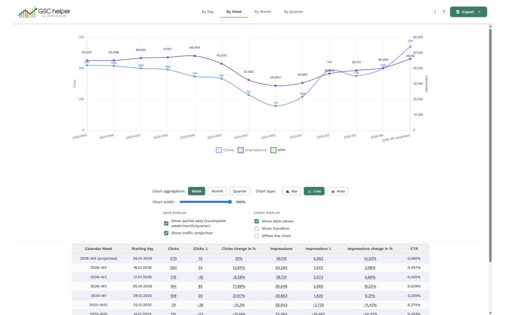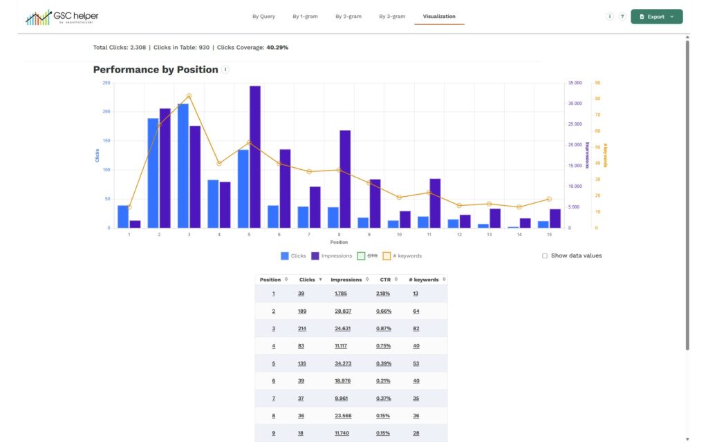 Do you know that Google Search Console is usually only providing 30 to 40 % of all queries with clicks? Analyze your query clicks coverage with ease! Let GSC Helper split your search queries into n-grams, and view clicks & impressions aggregated by position.