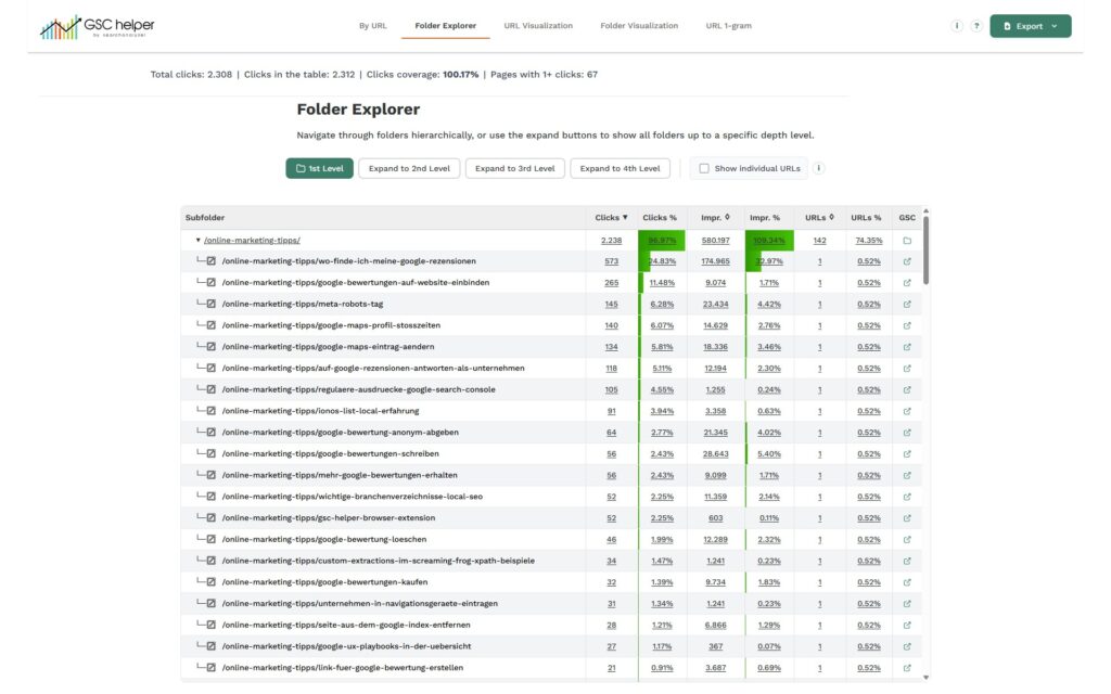 For most websites, only a view pages are the core traffic drivers. While you view your page data in GSC, you can create an enhanced table that provides the traffic share of each URL and sums up the data by folder.