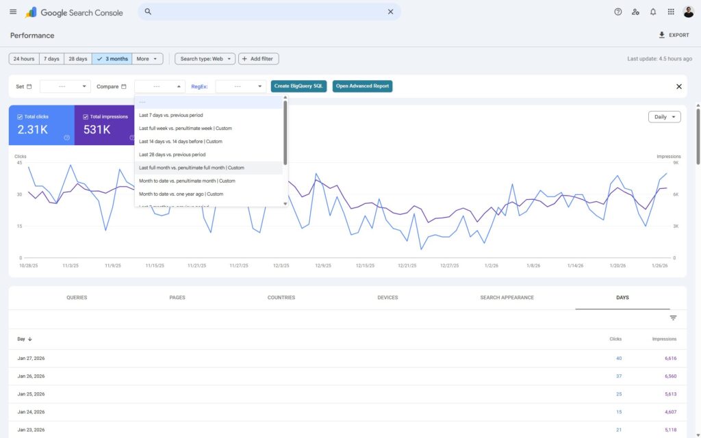 - Configure GSC performance report as you need it, especially set the time frame longer than 1 month