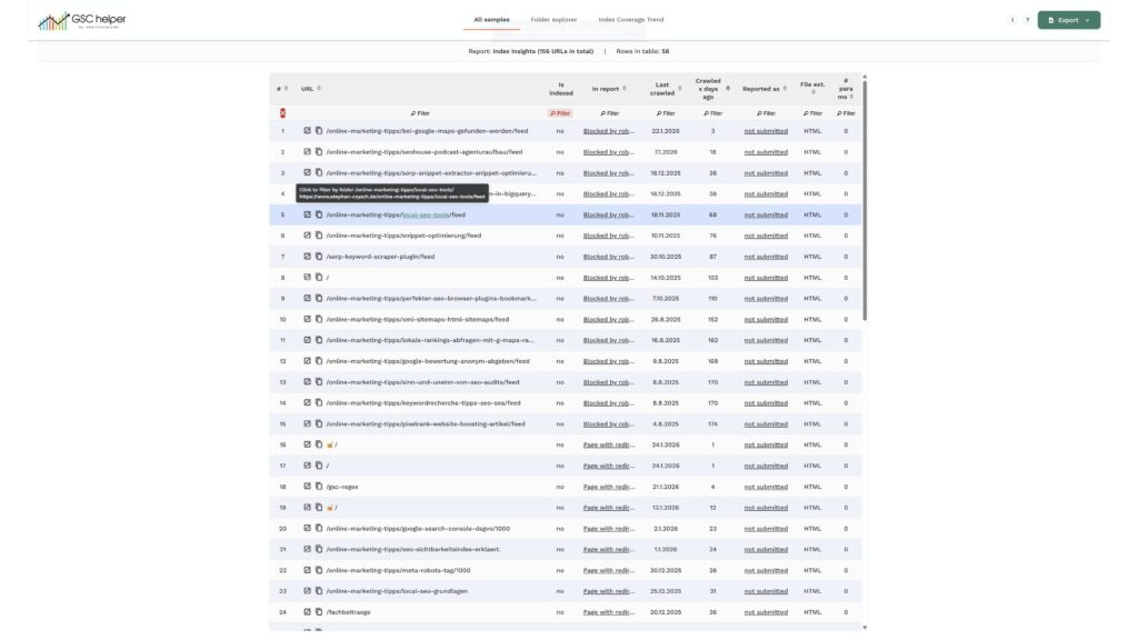 - Perform a right-click to extract the table alongside e.g. crawl dates or other information from the GSC Helper context menu