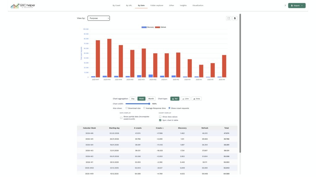 - The new „By date“ view aggregates crawl stats by week / month AND status code groups